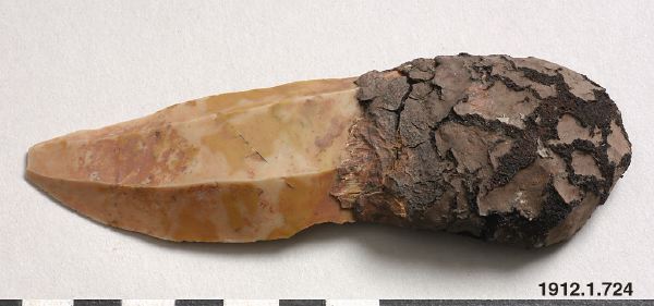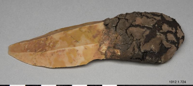 • Kniv tillverkad av rödaktig flinta som har ett skaft av kitt tillverkat av ett kådaliknande material.