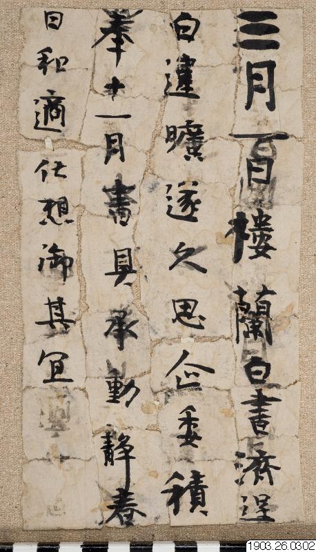 Fragment av handskrift på papper ur Sven Hedins samling av arkeologiskt material från Loulan. Monterat på textil. "Brev från Lou-lan av den 3:e månadens 1:a dag. Tsi Ch'eng säger: Det är länge sedan vi träffades och jag hoppas på ett återseende. Ert brev av den 11:e månaden har jag fått och ser därav att det går Er väl. Då vårens dagar äro så angenäma tänker jag nu att Ni njuter av deras välgörande..."" övers. av Conradys tyska text till utställning: "(Privat)brief aus Lou-lan vom I. Tage des 3. Monats. Tsi Ch'eng sagt: Es ist lange her, dass wir uns nicht gesehen haben, und ich hoffe sehr auf Wiedersehen. Ihren Brief von II. Monat habe ich erhalten und daraus ersehen, dass es Ihnen gut geht. Da die Frühlingstage (so) angenehm sind, so denke ich jetzt, Sie werden ihre Wohltat geniessen ..." Conrady, 1920, pp. 78-79.