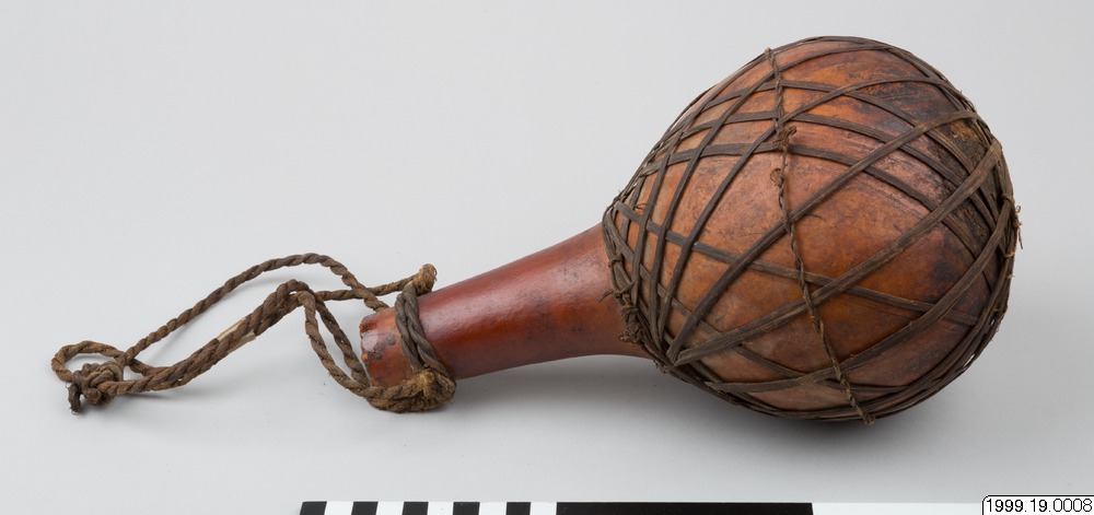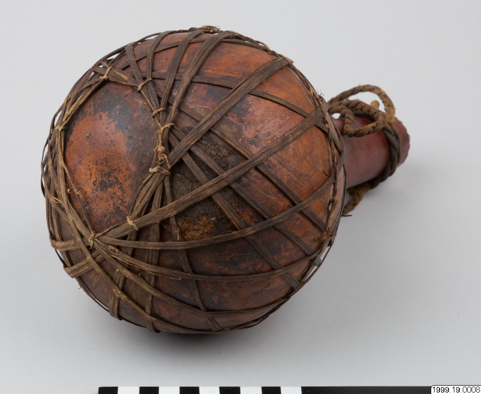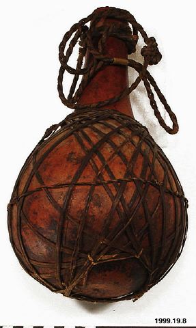 "A gourd (no ornaments), with strings tied around it (plaited) to make it possible to carry it. The gourd was used for carrying water." Wahlquist, Håkan. 1993. Inventory of the Ethnografic collections of Arne Sucksdorff.
