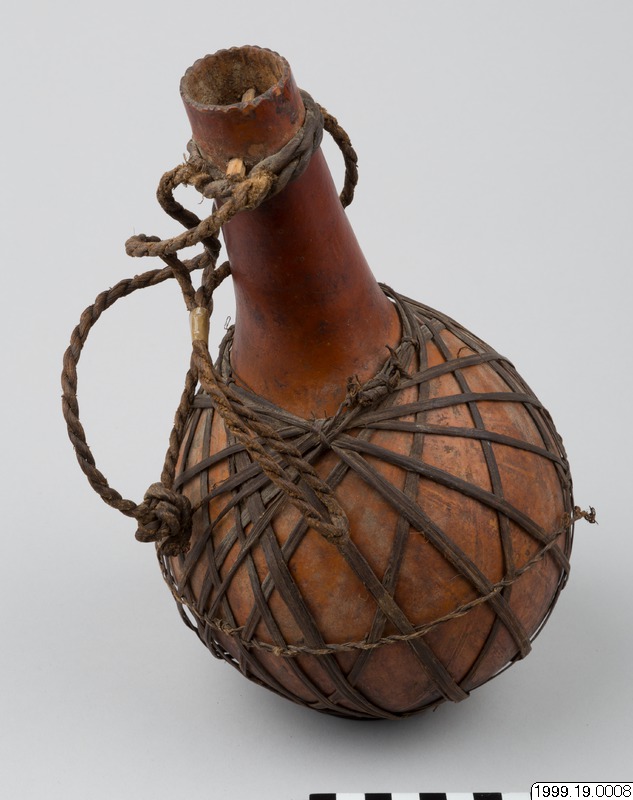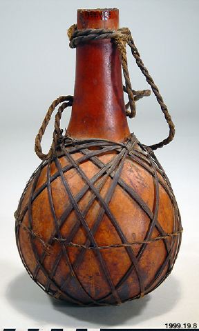 "A gourd (no ornaments), with strings tied around it (plaited) to make it possible to carry it. The gourd was used for carrying water." Wahlquist, Håkan. 1993. Inventory of the Ethnografic collections...