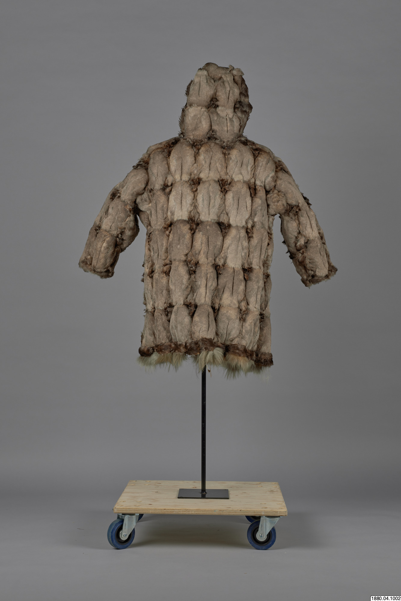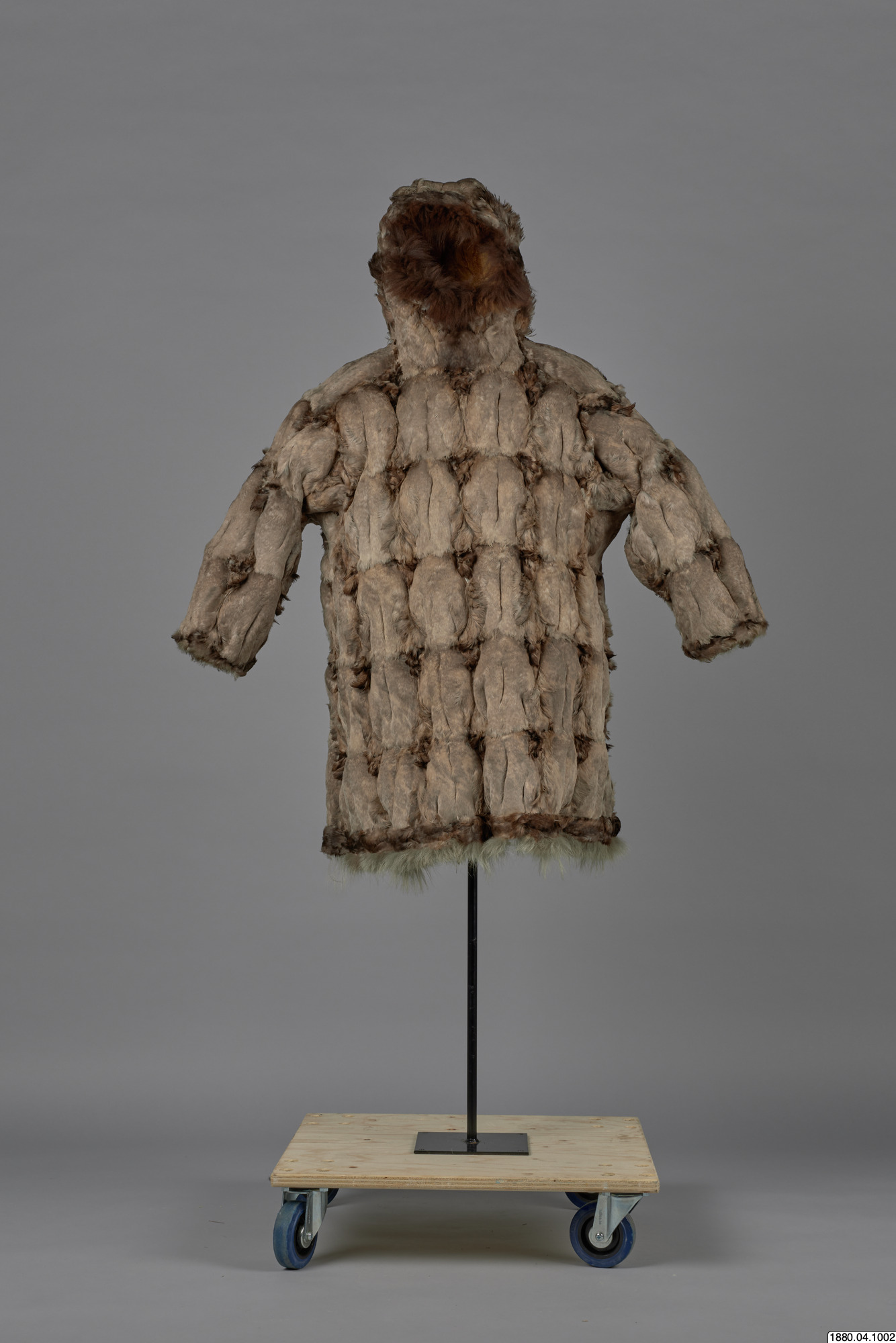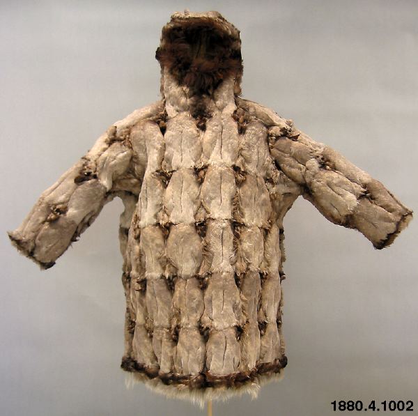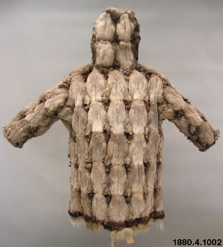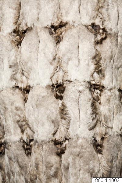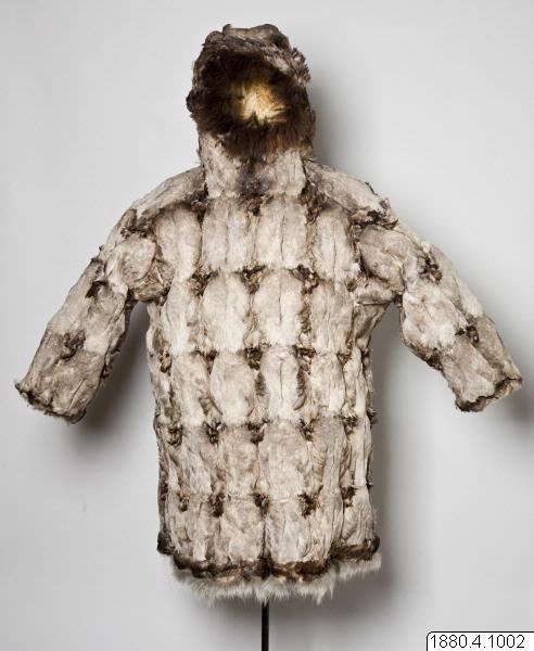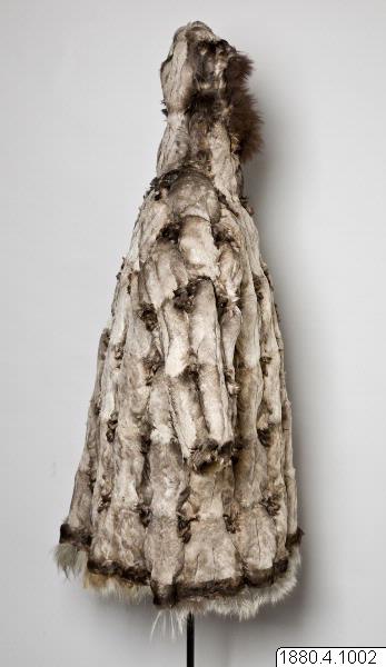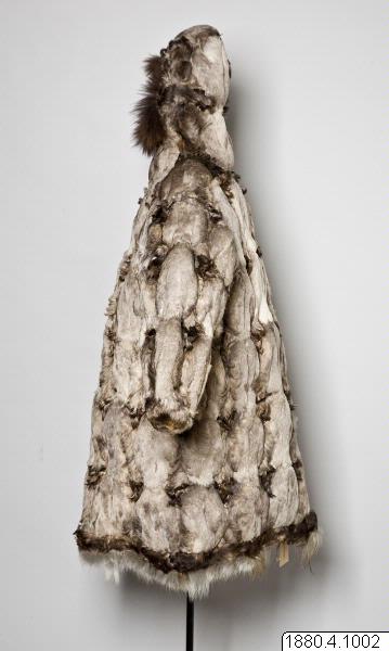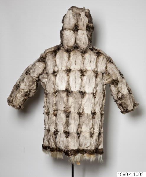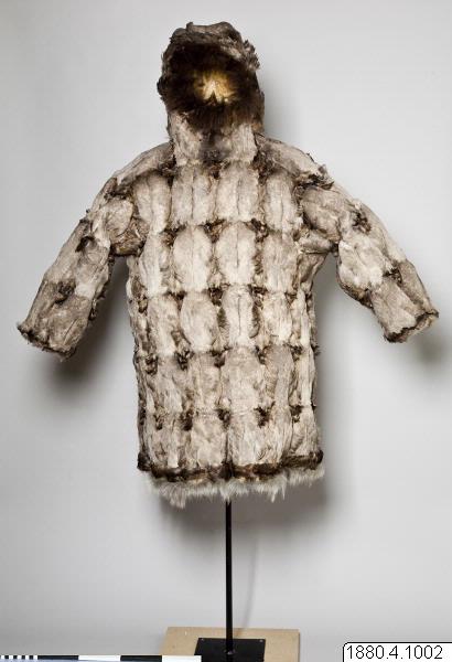 Päls för kvinna i anoraktyp - rak modell med kåpa. Hopsydd av ljusgråbruna fågelskinn (eiderbröst) med fjädersidan utåt. Kåpan kantad med brun björnpälsremsa och den raka nederkanten med band av brunt fågelskinn och nederst grått renhår. Bredd 134 cm, ärm, 74 cm, ner. [[Textil]]