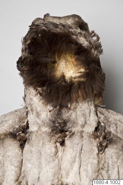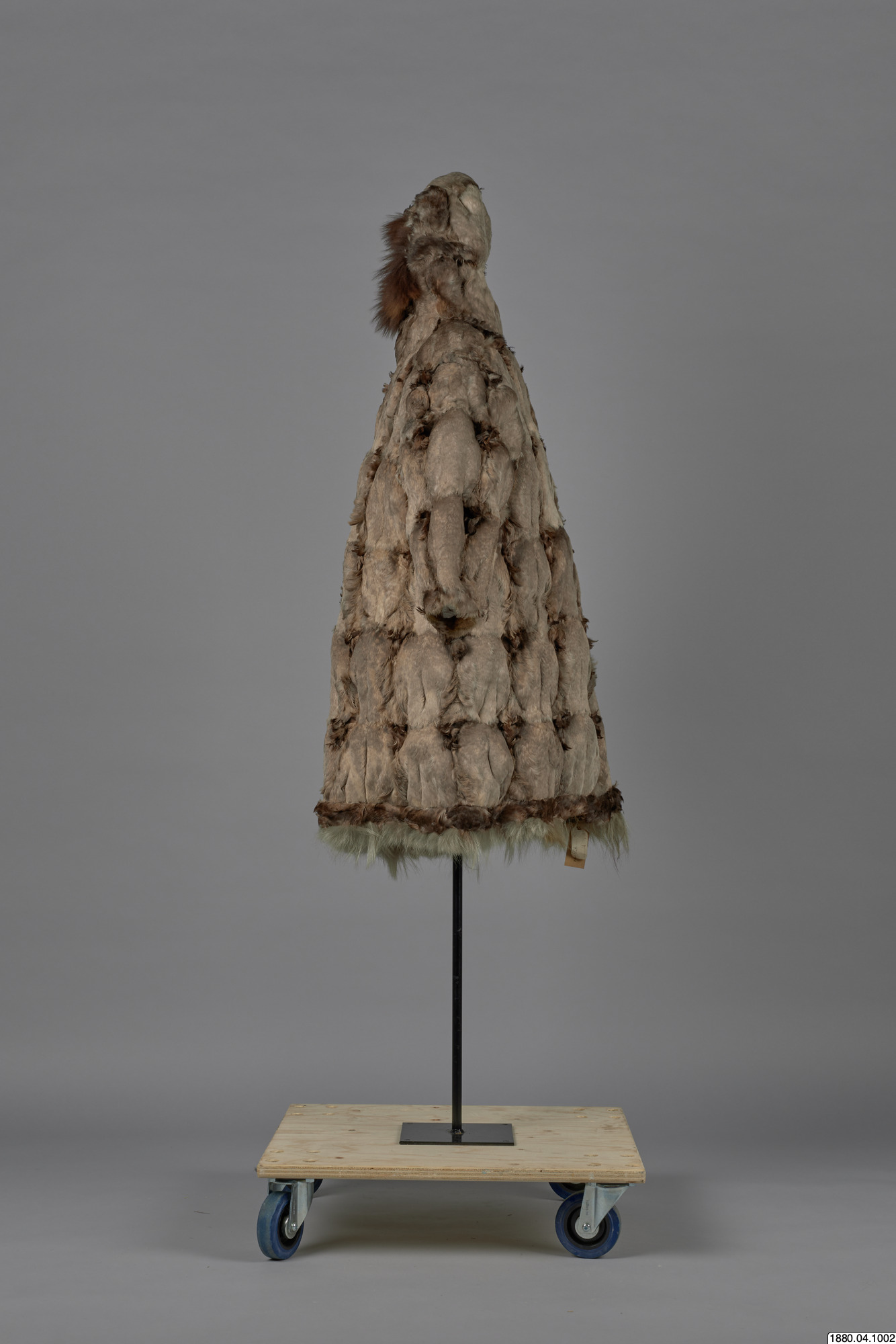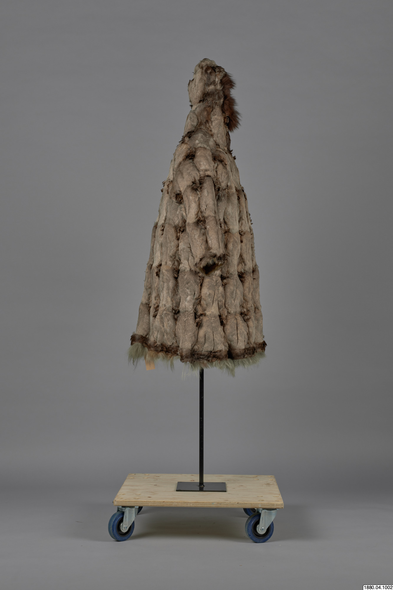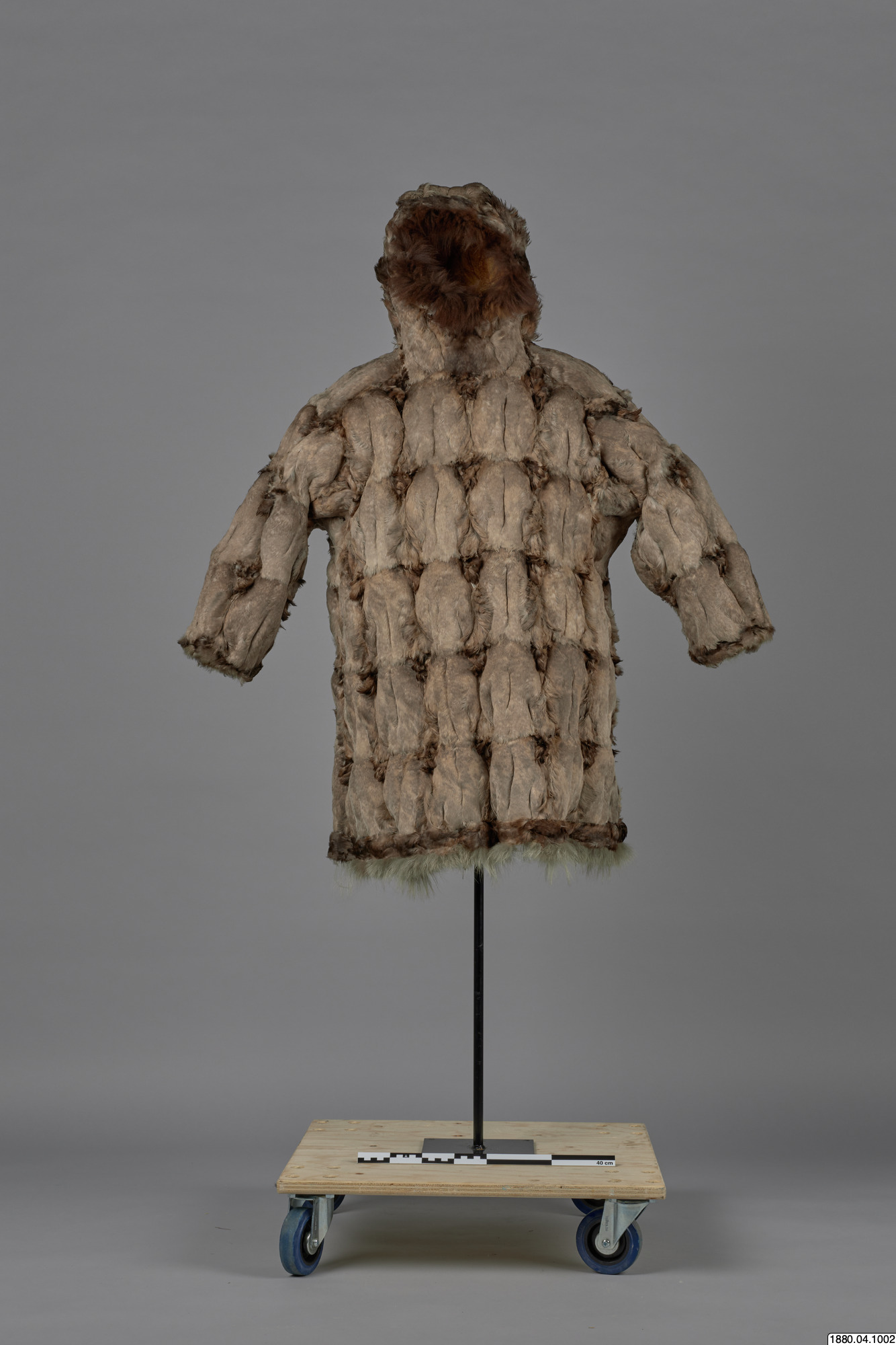 Päls för kvinna i anoraktyp - rak modell med kåpa. Hopsydd av ljusgråbruna fågelskinn (eiderbröst) med fjädersidan utåt. Kåpan kantad med brun björnpälsremsa och den raka nederkanten med band av brunt fågelskinn och nederst grått renhår. Bredd 134 cm, ärm, 74 cm, ner. [[Textil]]