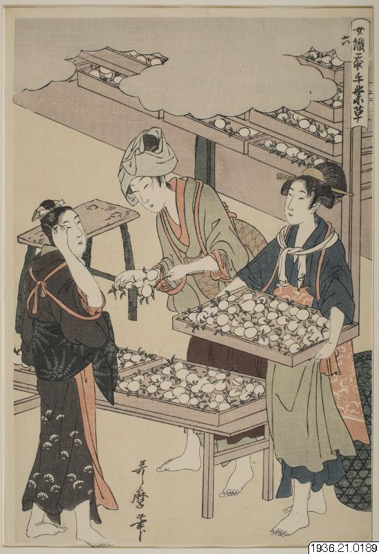 Färgträsnitt, japanskt. "Silkesmaskuppfödning, en kvinnosyssla". Bild sex av tolv:"The cocoon stage," depicting a girl arranging the cocoons on a tray, another holds a full tray and another watches the scene " enligt information från: http://www.christies.com/lotfinder/Lot/kitagawa-utamaro-1753-1806-joshoku-kaiko-tewaza-kusa-5180471-details.aspx (PH)