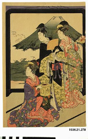 • Tre personer kimonoklädda i ett rum framför en skärm som avbildar berget Fuji. Träsnitt av Utagawa Toyohiro. Mittenbild i triptyk som visar kvinnor med en man (i svart).