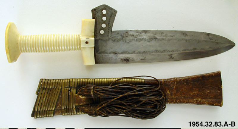 Dolk med balja. Symmetriskt blad av järn, dekorerat på båda sidorna. Skaft av elfenben, 1960 skadat baktill. Bladet har, närmast skaftet, vid den ena eggen ett utskott med fyra runda hål. Baljan av läder och till något över sin halva längd omlindad med band av mässing. På baljans ena sida en ögla av läder, i vilken ett knippe lädersnören äro fästade. Dolkens max. 1ängd 22,8 cm, baljans 19,5 cm. Från Mangbettu. (generalkatalogen)