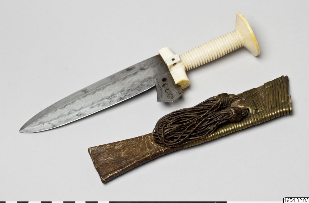 Dolk med balja. Symmetriskt blad av järn, dekorerat på båda sidorna. Skaft av elfenben, 1960 skadat baktill. Bladet har, närmast skaftet, vid den ena eggen ett utskott med fyra runda hål. Baljan av läder och till något över sin halva längd omlindad med band av mässing. På baljans ena sida en ögla av läder, i vilken ett knippe lädersnören äro fästade. Dolkens max. 1ängd 22,8 cm, baljans 19,5 cm. Fr...