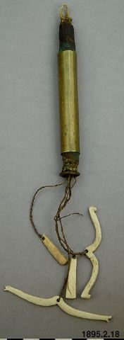 Synålsfodral av en rulle bomullstyg, vilken är hopsydd med sentråd. I övre ändan en sentrådsögla, i den nedre en läderskiva-vari på snodda sensnören fyra benbitar äro hänga nde. över själva håldynan är en mässingcylinder påträdd. [ocr]