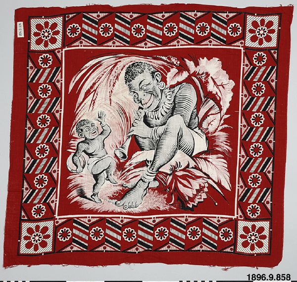 Rektangulärt stycke i tuskaftvävd bomull. Tryck i rött och svart på vit botten. Ett centrerat bildmotiv med musiker och danserska och bård längs sidorna. Två stader, två råa kanter. Vådbredden 73 cm. Enligt katalogen tillverkat i Europa för försäljning i Surinam.