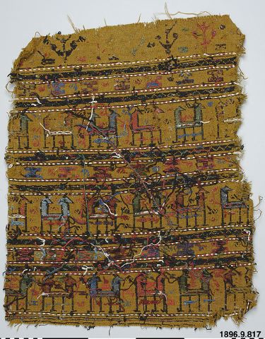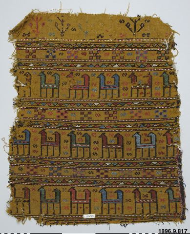 • Vävt stycke i tuskaft, över hela ytan inplockade mönster av djurmotiv med mellanliggande bårder. Föremålat fransar sig, möjligen utklippt ur större föremål. Enligt katalog, inköpt i Turkiet.