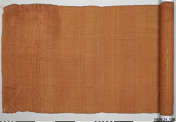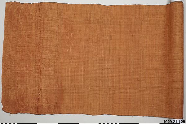 • Roströd väv i tussasilke(?) i tuskaftsbindning. Stadkanterna finns kvar, kortsidorna ligger öppna. Enligt katalog: schal för en Sagetjin lama.