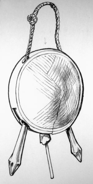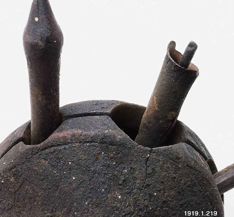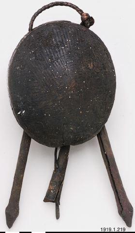 • Mörkmålad bjällra med tre kläppar varav två av trä och en av järn. En "ndibu" bjällra, för mer info om denna se 1919.01.0214.