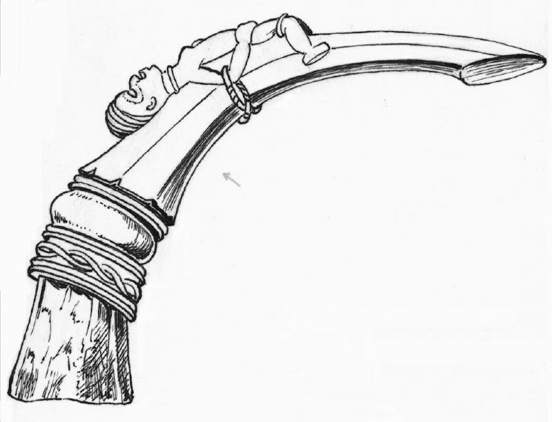 Snidad amulett av flodhästtand. Nkisi Mbumba består generellt av en stor och tung textilpåse, med eller utan skulptur. I Mayombe området är skulpturen i sig ofta tillverkad av flodhästtand, vilket detta föremål består av. Således är detta föremål den enkla statyn, vilken i sig är kraftlös utan tillhörande bilongofylld (kraftbärande substans) påse. Själva den kraftbärande påsen bärs i en mpidi-korg, vilken är en vardagskorg att bära bördor i. I korgen finns, förutom mediciner/bilongo även stenar av olika former, vilka representerar olika former av invärtes tumörer. I övrigt finns även vildsvinsbetar, vassa delar på nötter, gräs och andra föremål vilka representerar skjutande, stickande, och smärta. Nkisi mbumba tillhör det mycket gmla nkisi släktet. Vid tiden då mbumba kom till fanns mycket få minkisi varför de hade många olika funktioner. När senare fler och fler olika minkisi kom till blev de också mer och mer specialiserade i sina funktioner. Nkisi Mbumba har således många funktioner, varav vissa har att göra med tumörer och liknande oroligheter i buken. En patient kan bli behandlad genom massage vilken genomförs genom att en dörr placeras på den liggande patienten och nganga (mästern vilken dirigerar Mbumbas krafter) balanserar ovanpå. Patienen kan även behandlas genom medicindryck. Mbumba fungerar även förbyggande för stöld, speciellt av frukt. Mbumba fungerar även i strid där den skyddar krigarna och hjälper till attt ta fångar. Det finns en mängd olika Nkisi mbumba varav Mbumba Cindongo anses vara av störst vikt. Både män och kvinnor kan bli nganga för Nkisi Mbumba. (Laman 1962:100-102) Ovanstående information i Lamans monografi (Vol.III) bygger på evangelisten Babutidi Timotio (Cahier 016, Lamans samling, Riksarkivet) (MacGaffey 1991:179). Skulpturen är även i sig intressant, eftersom den har stora likheter i form och utförande med flera exemplar spiror i elfenben (också de från Mayombe-regionen) i museet i Tervurens samlingar (t. ex. EO.0.0.38571, EO.0.0.38570 och EO.0.0.43708). Dessa spiror delar motivet (som finns på denna skulptur) med den bundna slaven/fången men har dessutom en övre del som föreställer en hövding med sin munkwisa-rot i mungipan. Detta är ett vanligt förekommande tema i regionen (på spiror och andra prestigeföremål i trä och elfenben), vilket illustrerar hövdingens absoluta makt att ta (och ge) människors liv (MacGaffey 2000:137ff, not 3, s.249).