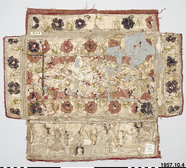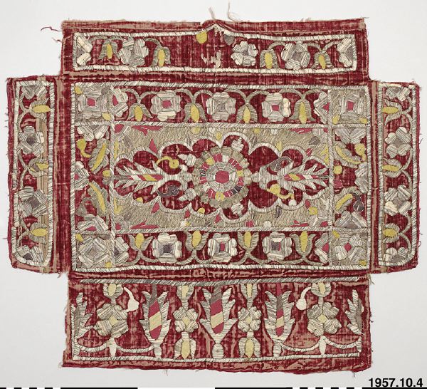 • Broderi på röd sammet. Har möjligen utgjort klädseln till bokfodral el dyl. Broderierna är utförda i metalltråd, guld och silver, samt silke. Samma teknik som föreg. nr. Upphöjt arbete över papper. Uppgavs vara 250 år. Förvärvad i Yezd. Största mått 56 x 46 cm. (generalkatalogen)