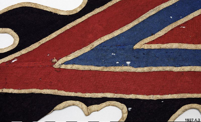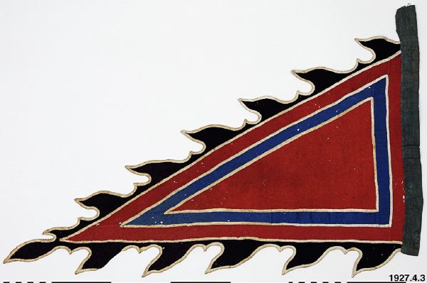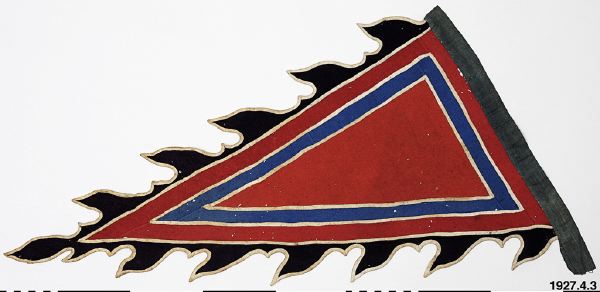 Triangelformad vimpel i ylle och bomull. Ylledelar i tre olika färger, skodda med vitt bomullsband. Längst två av kanterna är formen lik flammor. En kanal i ena sidan. Hela föremålet sytt för hand.