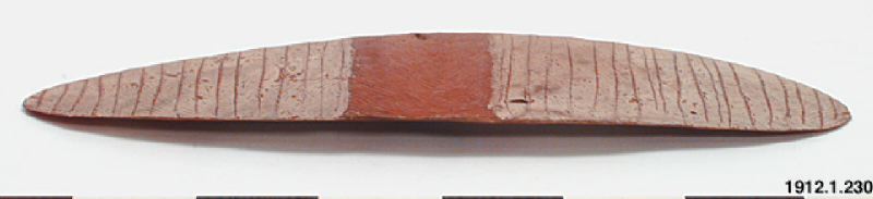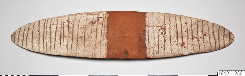 Sköld av trä, ornerad och målad röd och vit. Formen oval, svagt buktad i längdriktningen. Handtaget inskuret ungefär mitt på sköldens baksida. Den göres i allmänhet av ett lätt träslag och då skölden därtill är jämförelsevis både kort och smal, blir den ju ett mycket lätt och användbart försvarsmedel, som mer användes som ett slags parer-sköld, varmed fiendens vapen slås åt sidan. Denna typ utgör den s.k. Derby-skölden, då man huvudsakligen anträffar den i trakterna omkring den lilla kuststaden Derby i södra Kimberley, men även ute på Sunday Islands i Kingl's Sound. Denna sköld härstammar från Niggenestammen vid Fitzroy flodens nedre lopp. Skölden benämnes på de inföddas språk "márkah".
