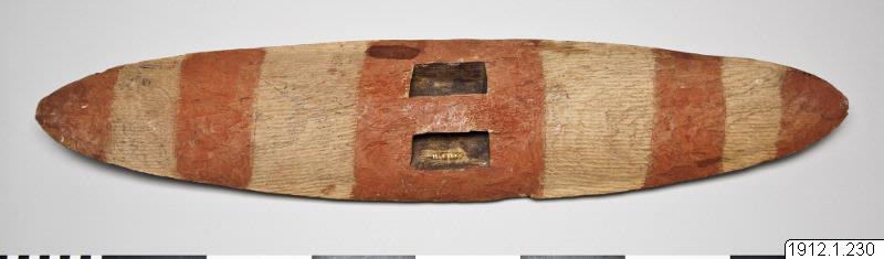 Sköld av trä, ornerad och målad röd och vit. Formen oval, svagt buktad i längdriktningen. Handtaget inskuret ungefär mitt på sköldens baksida. Den göres i allmänhet av ett lätt träslag och då skölden ...