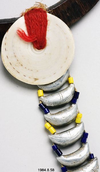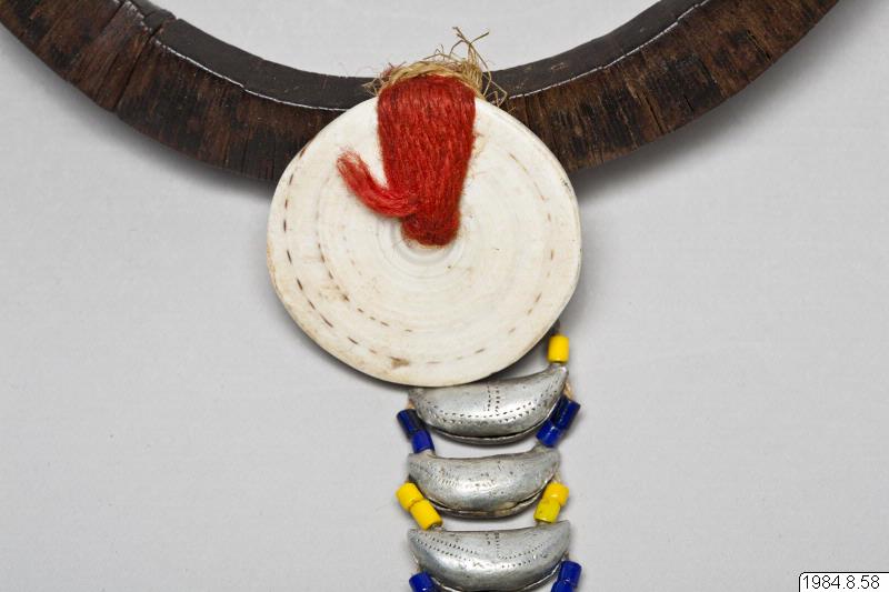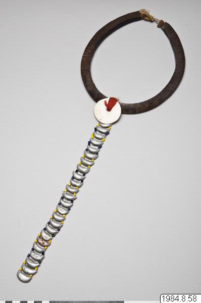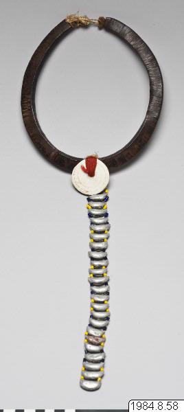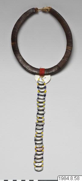 Halsband gjort av små, tunna, rektangulära träbitar från mutanga-trädet. Uppträdda på en tunn ståltråd till en cirkel. Mittemot knäppet av växtfibrer finns en rund conus-snäcka fäst med rött ullgarn virat runt träet. Därifrån hänger slutna båtformade pinglor som ett hänge. Mellan varje pingla finns gula och blå pärlor uppträdda på tråd. Den sjätte pinglan nerifrån har rester kvar efter röd färg. Antagligen tillverkad i slutet av 1960-talet. jfr. 1984.8.55 [Jfr. 1984.8.55]