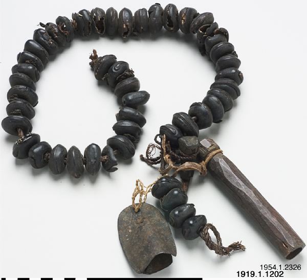 • Band av stora frön uppträdda på snöre samt mindre järnklocka med kläpp och flöjt fastbundna vid denna. L.1202 SMF:192.