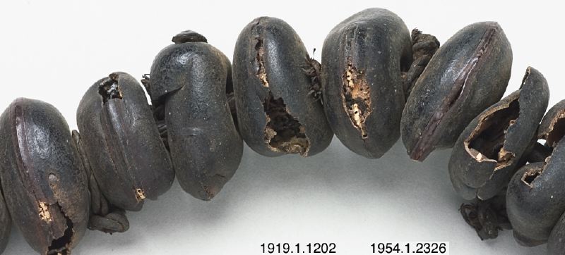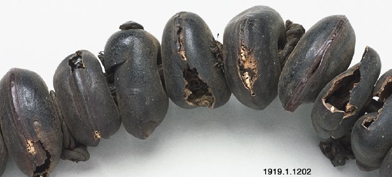 • Ett band av tätt trädda frökärnor. Vi ena änden av band siter en klocka i metall, ett ihåligt, cylinderformat trästycke samt en djurtand omlindat med textil. Detta är ett band för nganga för Nkisi Mbenza.