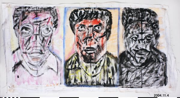 Målning på enkel bomullsväv. Tre huvuden, en face, är enkelt upptecknade bredvid varandra. De är avskilda från varandra så att de bildar en triptyk. Svarta konturlinjer dominerar intrycket. Det vänstr...