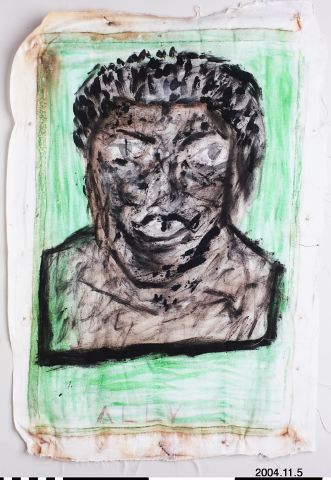 Målning på enkel bomullsväv. Ansikte tecknat rakt framifrån, grovt, snabbt tecknat i svart färg, övre läppens överdel tydligt markerad, Grön bakgrund. Utförd ca. 2001-02. [[Etno]]