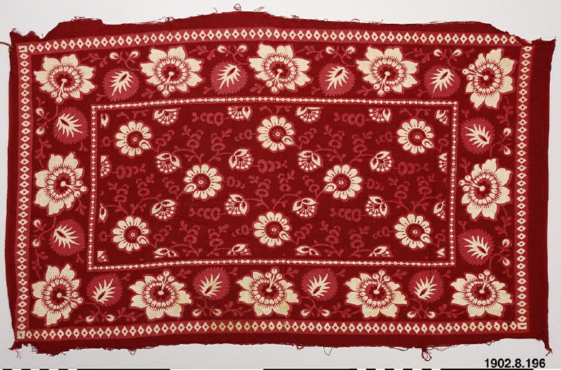 • Bomullsväv i tuskaft, vit botten med tryck i rött och rosa. Stadkanterna finns kvar vid kortsidorna, långsidorna ligger öppna. Blommönster.