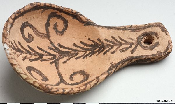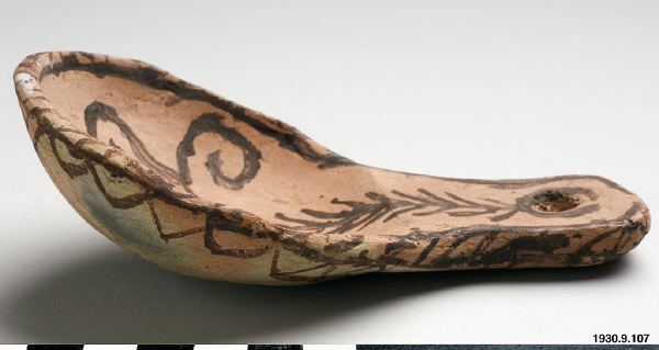 Sked av lera av dålig kvalitet. Ornament i svart på vit-röd botten. (generalkatalogen)