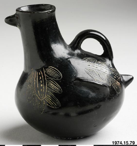 • Prydnadsvas av svartmålat gods. Formad efter en fågel. Vita bladformade linjer.