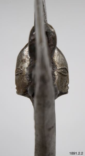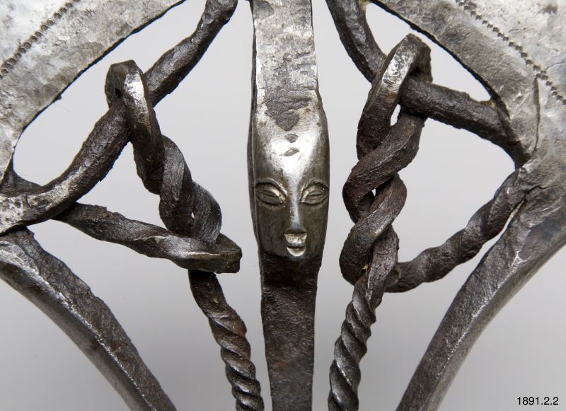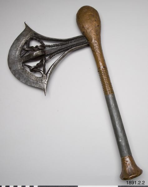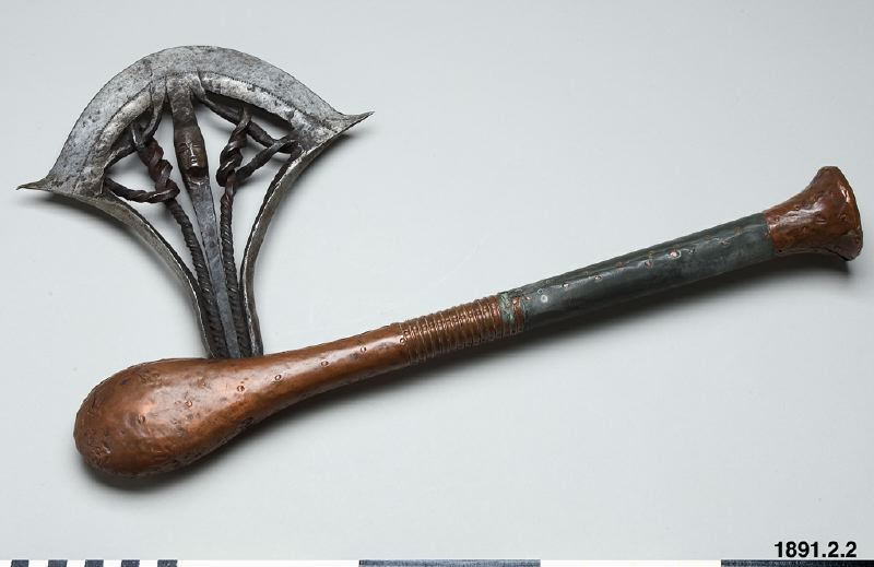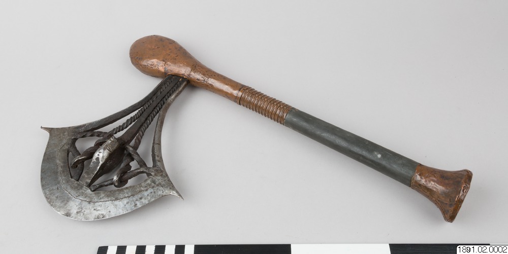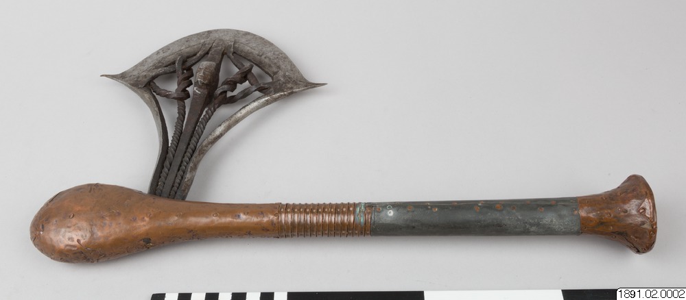 • Stridsyxa med skaft av trä, övre delen av skaftet klubbformig. Skaftändan utsvängd och avplattad. Huvudet insatt i skaftet och fastnitat. Det består av en smal egg vid vars mitt spiralvridna järntenar är fastsmidda. Skaftet klätt med tunt koppar och zinkbleck, som fasthålls med små kopparnitar. Huvudet betydligt mer utsirat. Eggen prydd med en rad fördjupade prickar. Mellan de två spiralvridna jär... Visa hela