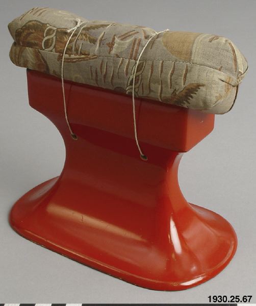 Huvudgärd (kudde) för komplicerat uppbyggda frisyrer tillverkad av rödlackerat trä och textil.