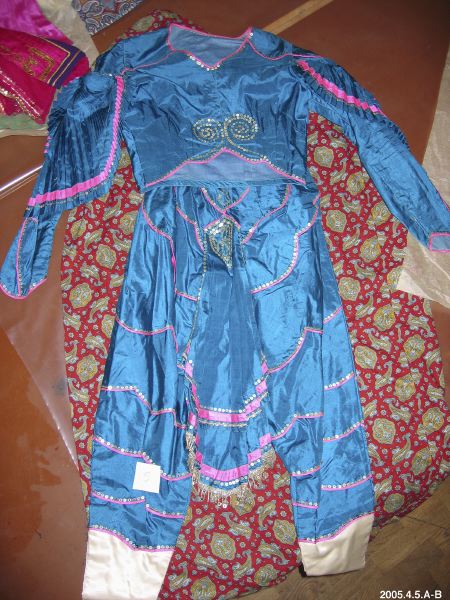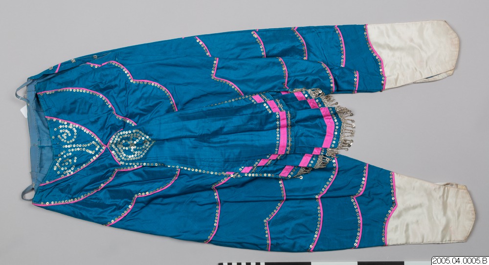 • Dräkt i två delar: jacka och byxor av blått siden med rosa detaljer och mönster av paljettknappar.