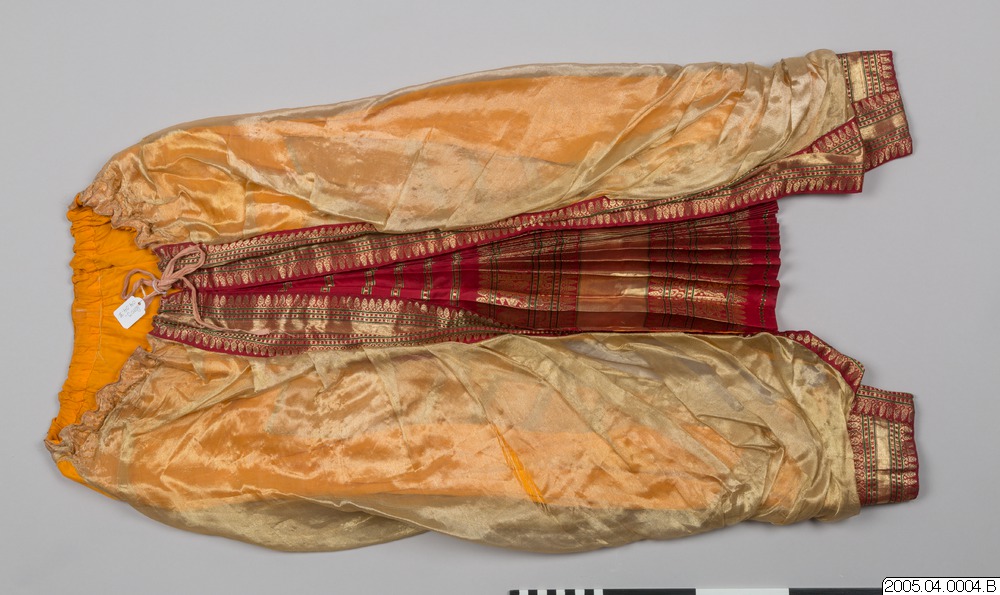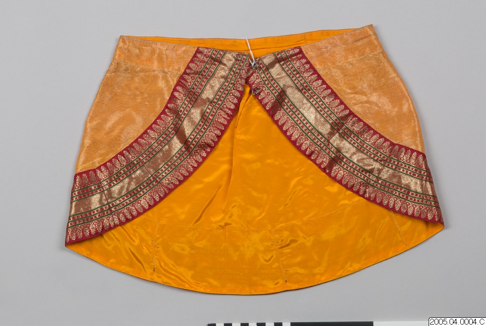 • Dräkt i tre delar; jacka, byxor och höftstycke, av gult sidentyg.