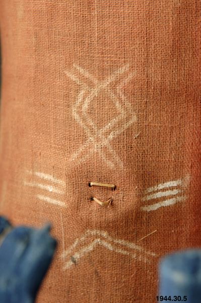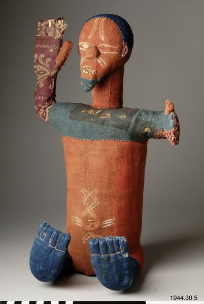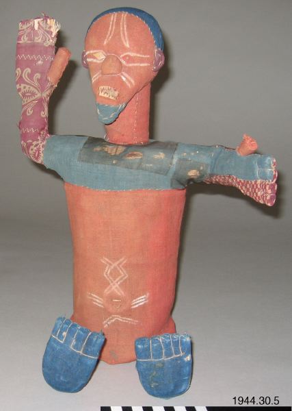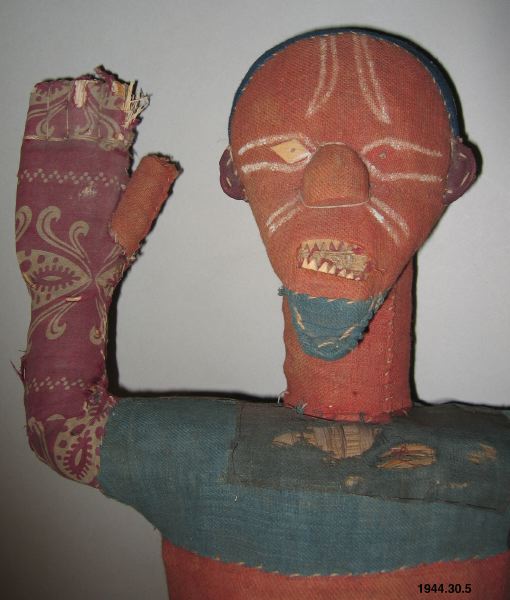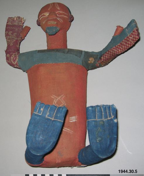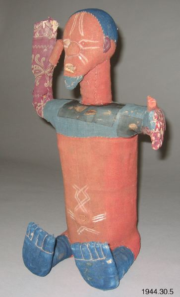 • Sittande uppstoppad figur, klädd med rött och blått tyg. sträckt, de h andra sträckt uppåt. (Se foto i bildarkivet). Tänder och romboida ögon av påsatt trä (eha ögat saknas). Vita figurer målade på "g... Visa hela
