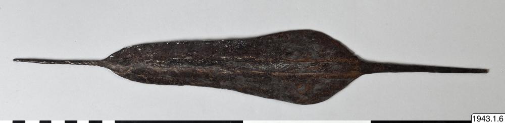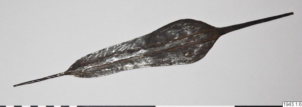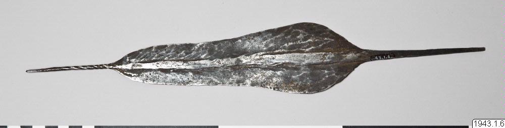 "Mynt" av järn. Spjutspetsformigt med utdragna spetsar i båda ändar. Den övre spetsen är smalare och spiralvriden. "Ämne av järn till vapen, användes som mynt" (anteckning av Svin hufvud) Se teckning. "Als Geld fungieren im Mangbetu-Gebiet die von den Bakango aus Eisen hergestellten "Messer" "mbeli" Wacqez erwähnt für das "Speergeld" den Namen "mapuka". (Van Overbergh, C. et E. de Jonghe, Les Mangbetu. Bruxelles 1909 s.. 477). "Die Regierungsstationen benutzen als Scheidemünze 14 cm. lange Stücke Messingdraht von 3-4 mm Durchmesser, die einen Wert von 5 Ct. haben und "mitako" genannt werden. Von den Eingeborenen wird dieses Messinggeld recht ungern genommen". (Czekanowski anf.arb. s.133, Abb.24). Längd: 37,8 cm. Största bredd: 6 cm. Belgiska Kongo Mangbetu (generalkatalogen)