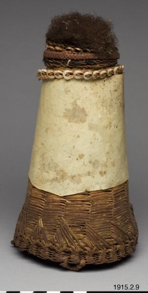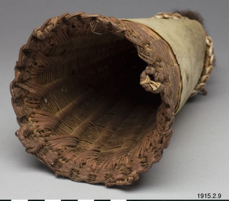 för man. Trattformigt flätverk, på' Utsidan täckt av ett skinnstycke,fastsatt med 2 pinnar. Upptill prytt av 2 rader vita musselpärlor och en tott löshår/s/ Höjd: 17,7 cm. Vidd nedtill: 10,5 cm. Se Mö...