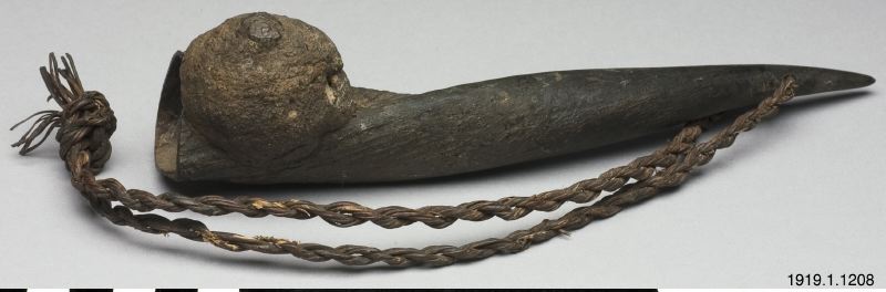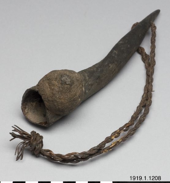 • Ett horn, ihåligt med en klump fastsatt nedtill och ett snöre fastknutet upptill.