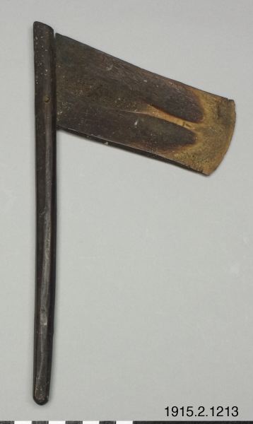 Yxa med blad av sköldpaddskal som är vässat och insatt i en skåra i ett glättat träskaft, har enligt Mörner använts till att skala "fula/vula som är en lång form av taro. Klingan är böjd åt vänster,...