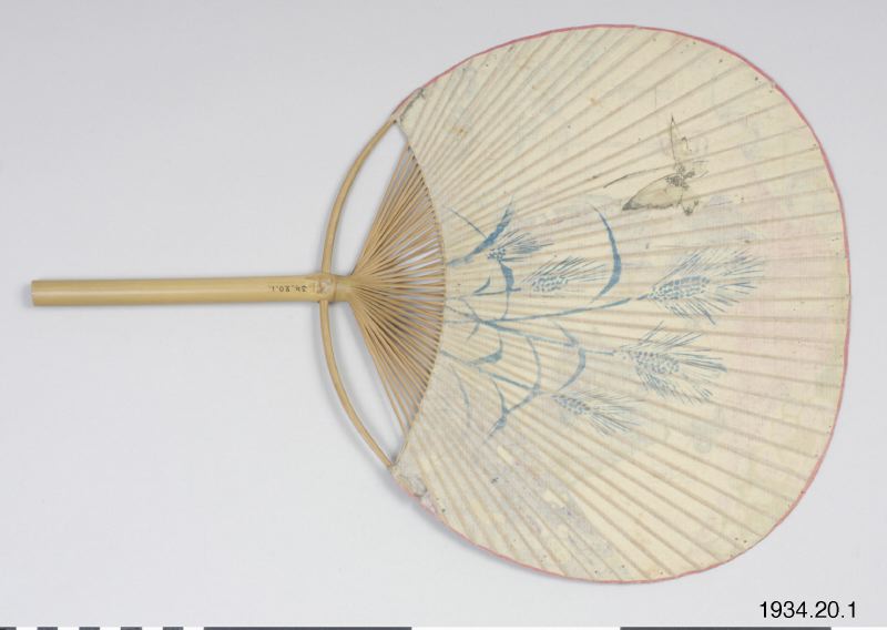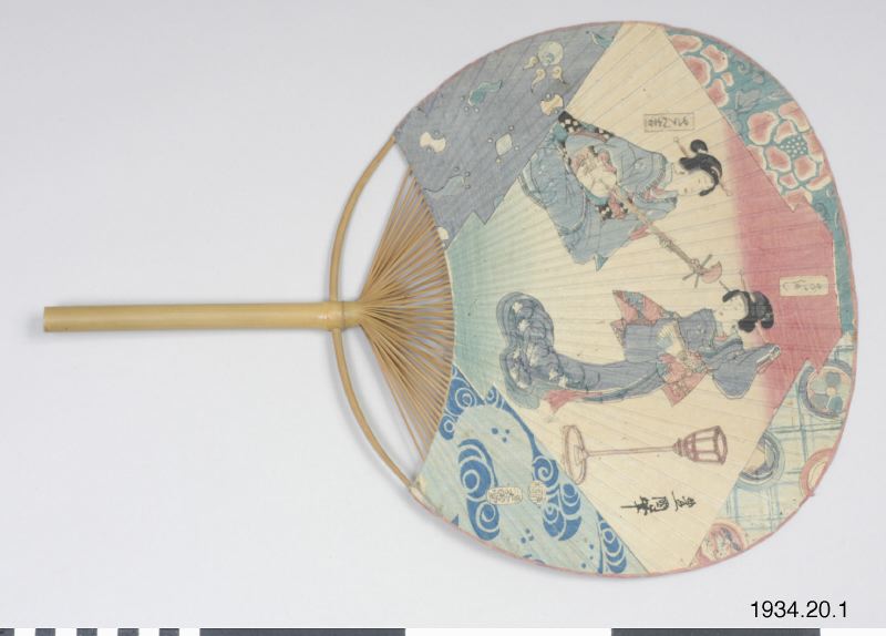 Översidan försedd med en bild av en dansande geisha som ackompangeras av en på golvet sittande geisha, som spelar på ett stränginstrument. /general katalog