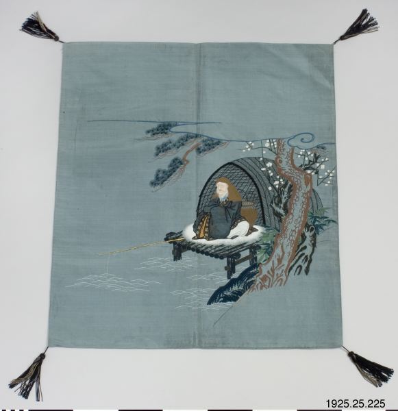 Metande eremit, sittande på en i en ström utskjutande brygga framför sin hvälfda koja af flätverk. Därbredvid en tall och ett knoppande plommonträd. Hår och skägg broderade med verkligt hår (hvitt). Guld- och silkesbroderi på grårönt siden. I hörnen tofsar i svart silke och matt guld. Sannolikt 1800-talet. Inköpt i Tokio 1902. Japanska utställningen 1911. /se Bildt, Didrik, Japonica, Stockholm 191...