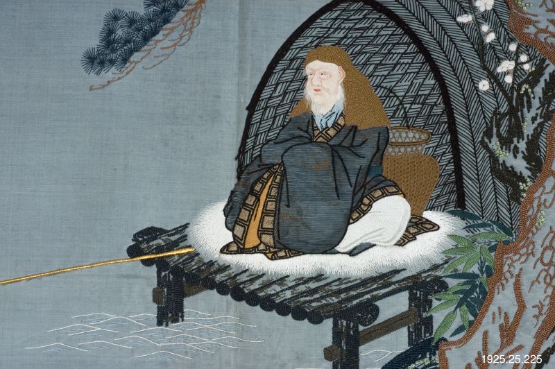 Metande eremit, sittande på en i en ström utskjutande brygga framför sin hvälfda koja af flätverk. Därbredvid en tall och ett knoppande plommonträd. Hår och skägg broderade med verkligt hår (hvitt). Guld- och silkesbroderi på grårönt siden. I hörnen tofsar i svart silke och matt guld. Sannolikt 1800-talet. Inköpt i Tokio 1902. Japanska utställningen 1911. /se Bildt, Didrik, Japonica, Stockholm 1914, sid 374 ff.