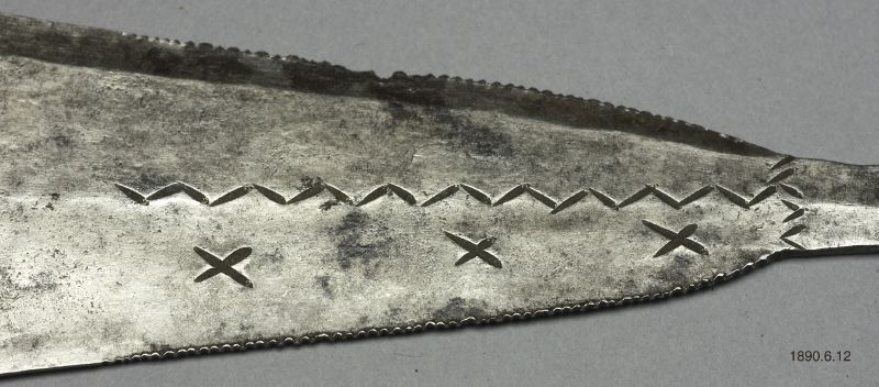 Av metall, ev järn eller plåt, smidd kniv. Stort platt blad. Viss dekor på bladet i form av kryss. Mer att läsa om vapen hos ngala, i African Weapons, sid 182-184, 186-190. /KB.