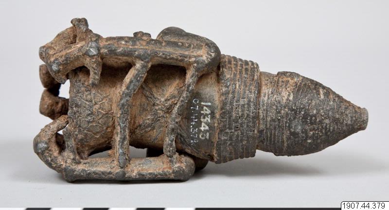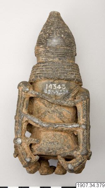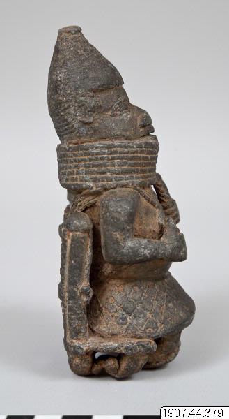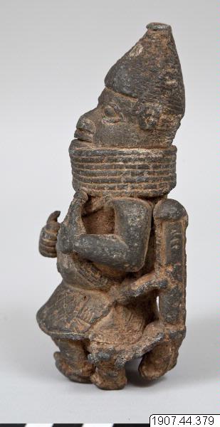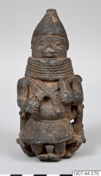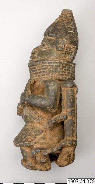 Utställningstext STADEN (kopplat till föremålet): Det kungliga palatset var också platsen för en av de mest fascinerande konstformerna i Benin- rektangulära bronstavlor med avbildningar i relief av personerr och händelser i det ceremoniella livet vid hovet. Omkring 900 sådan relieftavlor finns kvar i världen idag och sägs i det gamla Benin ha hängt uppspikade på de takbärande pelarna i palatset, där de bildade en imponerande fond för de hovceremonier de delvis också avspeglar.