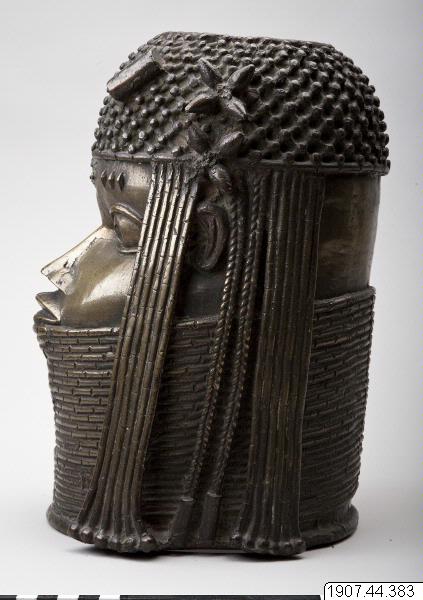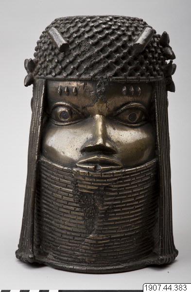 Minneshuvud över en Oba, avsett för förfadersaltare i det kungliga palatset. (Utställningstext STADEN 1998, kopplat till föremålet) "DÄR KUNGEN AV NÅD RÅDER ÖVER LIV OCH DÖD" Kungariket Benin ligger ...