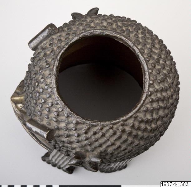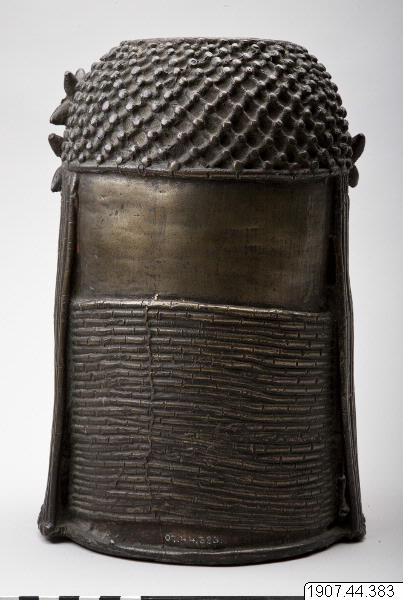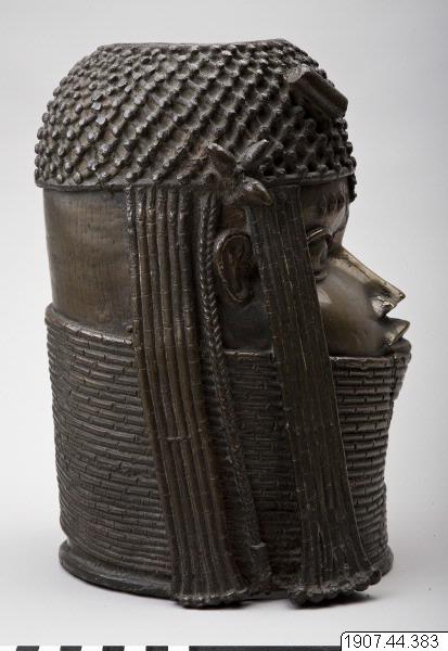 Minneshuvud över en Oba, avsett för förfadersaltare i det kungliga palatset. (Utställningstext STADEN 1998, kopplat till föremålet) "DÄR KUNGEN AV NÅD RÅDER ÖVER LIV OCH DÖD" Kungariket Benin ligger i den tropiska regnskogen i södra Nigeria. Majoriteten av dess befolkning är kända som edo, men också grupper av ibo, ijaw, yoruba och itsekiri bor inom rikets gränser. Kungarikets hjärta är dess huvudstad, som förr hette Edo men idag kallas Benin City. Utanför huvudstaden lever det jordbrukande folket i flera hundra byar under sina äldstes ledarskap. Benins kulrurrikedomar blev kända för västvärlden 1897 genom brittisk straffexpedition riktad mot Benin City, då tusentals konstverk från det kungliga palatset beslagtogs och senare spreds till museer och privatsamlingar över hela världen. Det är en kunglig konst som skapats för att förhärliga den gudomlige kungen, Oba, och hans föregångare. Också idag sitter en gudomlig kung, Oba Erediauwa, på tronen i Benin och styr över ett hängivet hov, över storslagna palatsritualer och över livaktiga konstnärsskrån. Detta sammantaget gör Benin City till ett religiöst och rituellt centrum och i kraft av kungamakten till en stad av gudomlig inspiration. (Utställningstext STADEN 1998, Benin City) "HÖGSÄTET FÖR OBA - HIMLENS UTVALDE" Benin City, i dagens Nigeria hem för omkring 200 000 människor, har alltid varit kungariket Benins administrativa och religiösa centrum, något som också avspeglar sig i dess uppbyggnad. Stadens kärna omges av en dikerad lerjordsmur som enligt traditionen skall ha anlagts av den sittande Oban vid mitten av 1400-talet. Området inom denna ringmur delas i två sektioner av en bred gata, där den mindre sektionen i sydväst inrymmer kungliga palatset och de olika palatssällskapens och palatschefernas hem, medan den större sektionen nordöst om skiljegatan bebos av stadscheferna och alla yrkesspecialister som arbetar för kungen, såsom de olika konstnärsskråna. Bortom denna inre mur sträcker sig en yttre mur, som inringar det område där kungens många rituella funktionärer bor. Inom den yttre muren ligger också de byar som styrs av Uzama, de mest uppburna hövdingarna i Benin med ansvar för de ritualer som skall trygga hela rikets välbefinnande. Just utanför den yttre muren ligger sedan drottningmoderns och tronföljarens båda palats. Så åskådliggör stadens själva planläggnning den gudomlige kungens centrala position, liksom motsatsförhållandet mellan palatschefer och stadschefer och Uzamas speciella ställning. Det kungliga palatset, en vidsträckt anhopning av byggnader och gårdar, är rikets och stadens hjärtpunkt, varifrån den andliga kraft emanerar som är så avgörande för hela rikets hälsa och välgång. Där i centrum av centrum förvaras också de kungliga förfadersaltarna med sina bronshuvuden, utsirade elefanbetar, klockor och andra föremål, som alla har en roll att spela i tillbedjan av de kungliga förfäderna och den jord i vilken de är begravda. (Utställningstext Staden 1998, Benin City)