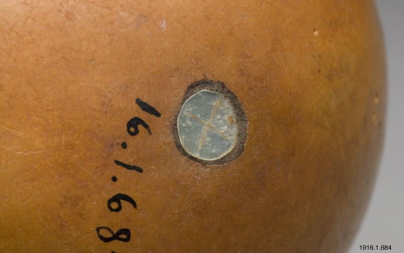 Kalebass innehållande kalk. Liten öppning i ändan. 1 bottnen ett hål, täckt av ett runt stycke pärlemor. Jmf. 678. Höjd 15,4 cm. Bredd 11,2 cm. [ocr]