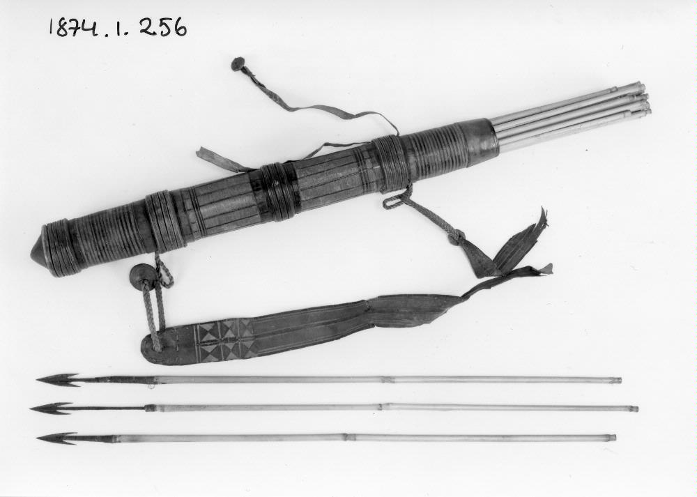 • Enl.generalkatalogen: Koger av läder med pressade sirat. Innehåller rörpilar med järnspets.