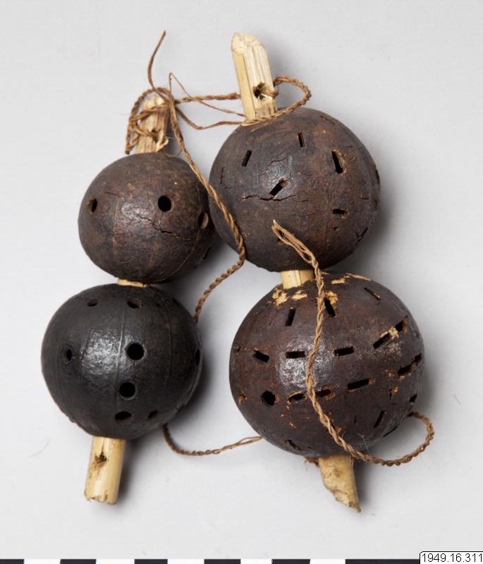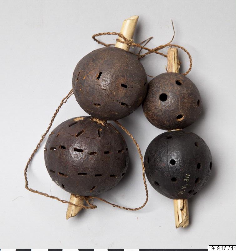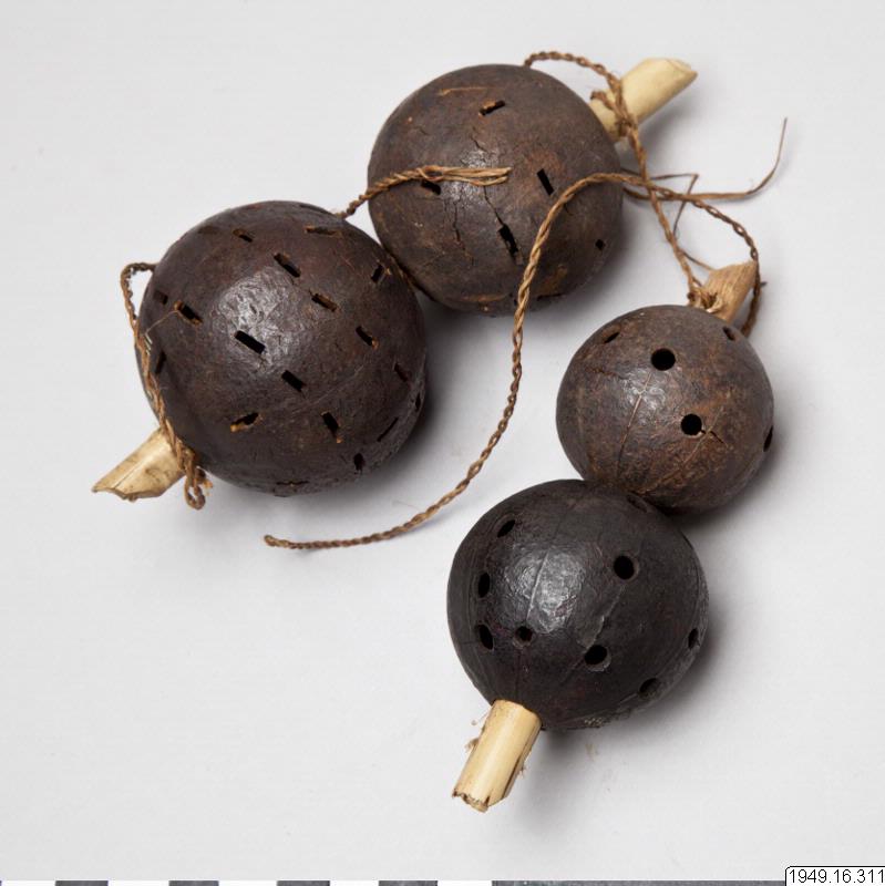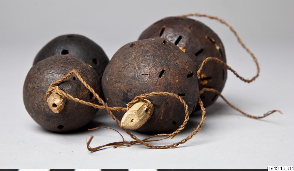 Bland musikinstrument må först nämnas de höga och smal, helt ihåliga skinnöverspända trummorna, vanligen ornerade med ristningar eller reliefer. De ha s.k. Pflockspannung. Spelas stående på marken och musikanten själv står. Om denne sitter, lägges trumman mot hans knän. Membran av antilop- eller gethud. En fläck av kautchuk anbringas alltid på skinnet och uppvärmes under det trumman bearbetas, vilket sker mer händerna.