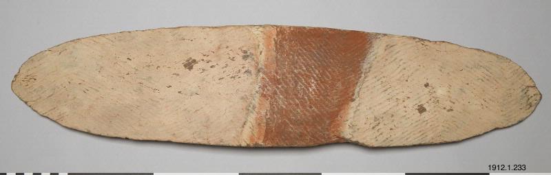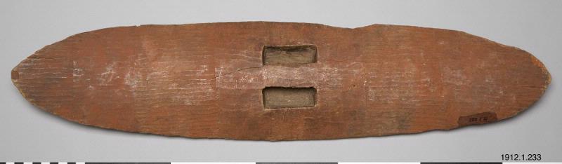 Sköld typisk för Derby-trakten i södra Kimberley oftast tillverkad av sandalwood. Tunn, litet bredare vid handtaget som är utskuret. Utsidan är dekorerad med inristade streck skurna i relief, målad röd och vit. Baksidan är målad röd.Används oftast som ett slags parervapen. Har skador på framsidan.