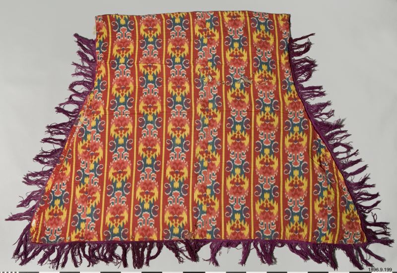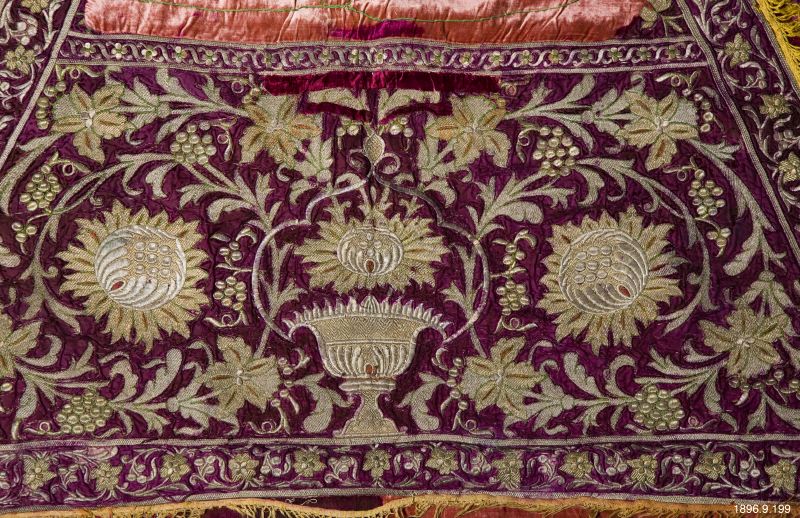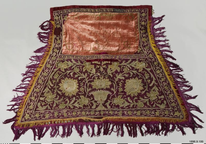 Hästtäcke av violett sidentyg broderat över hela ytan med metalltråd i plattsöm. På sittytan har ett ljusrosa sammetstyg infogats sekundärt. Långa, lila bomullsfransar och gula silkesfransar på tre sidor. Hästtäcket är fodrat med ett bomullstyg med tryckt mönster. Mellan tyglagren finns ett tunnt lager av ullvadd. Bottentyget är sekundärt bemålat.