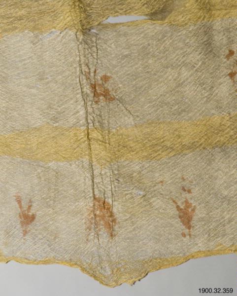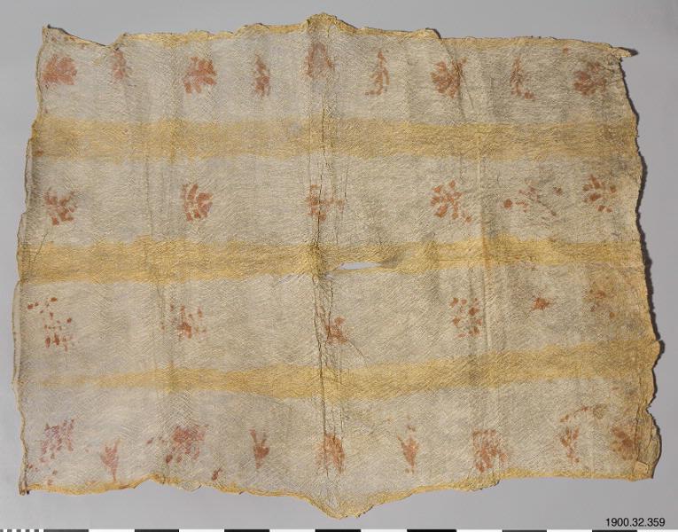 Rektangulärt mycket tunt s.k. barktyg av utbultad innerbark av mullbärsträdet, med en sida bemålad med gula ränder och rader med roströda figurer emellan ränderna.